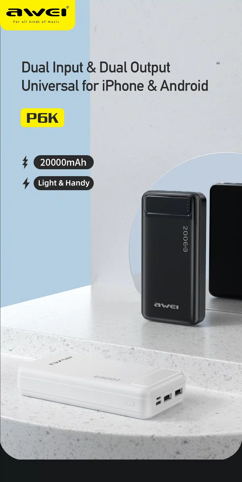 আধুনিক যুগের স্মার্টফোনগুলো যত বেশি শক্তিশালী হচ্ছে, ব্যাটারি লাইফ যেন ততই দ্রুত ফুরিয়ে যাচ্ছে। আর ঠিক এই সময়েই আপনার প্রয়োজন এমন একটি ব্যাকআপ যা আপনাকে রাখবে সবসময় সচল। Awei P6K ২০,০০০mAh পাওয়ার ব্যাংকটি সেই প্রয়োজনেরই এক আধুনিক উত্তর।