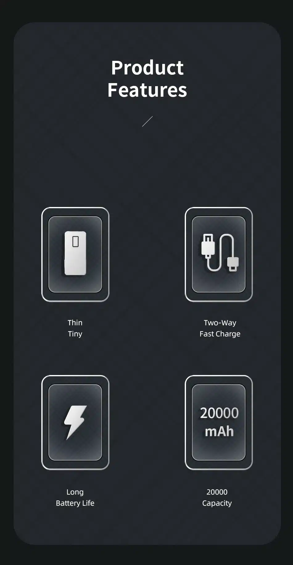 - ২০,০০০mAh উচ্চ ক্ষমতা: এই বিশাল ক্যাপাসিটি নিশ্চিত করে যে আপনার ডিভাইসটি সারাদিন ব্যবহারের পরেও ব্যাকআপের অভাব হবে না। এটি আপনার স্মার্টফোনকে গড়ে ৪ থেকে ৬ বার ফুল চার্জ করতে সক্ষম।