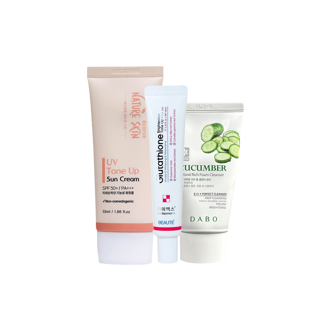 1. Dabo Natural Rich Foam Cleanser Cucumber 60ml 2. Nature Skin UV Tone Up Sun Cream SPF 50+ PA+++ 55 ml 3. Beaute Glutathione Brightening Tone Up Cream 45 ml